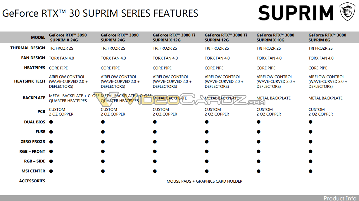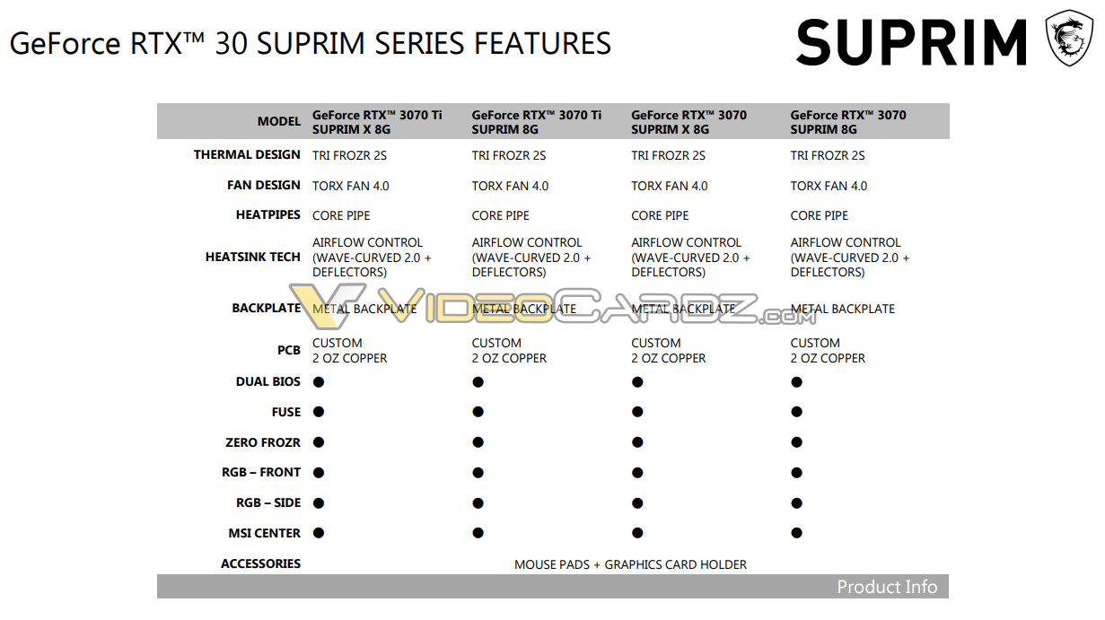 Videocardz również wcześniej ujawnił informacje o produktach z serii MSI SUPRIM i raz na zawsze zakończył debatę dotyczącą pamięci. RTX 3080 Ti stanowi znaczące ulepszenie w stosunku do RTX 3080 (jest to w zasadzie nieznacznie przycięty RTX 3090) przy 10240 rdzeniach. Z drugiej strony RTX 3070 Ti oferuje niewielkie ulepszenie w stosunku do RTX 3070.