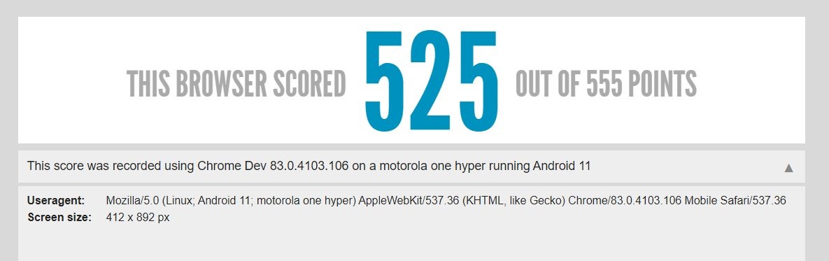 IST 11:20: Wygląda na to, że Motorola może testować Androida 11 dla Motorola One Hyper, ponieważ został zauważony w teście HTML 5 uruchomionym na najnowszej wersji Androida.