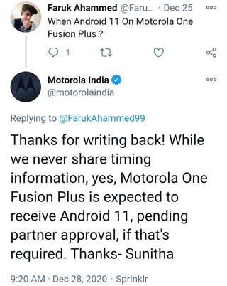 IST 15:00: Odpowiadając na zapytanie użytkownika dotyczące dostępności Androida 11 dla Motorola One Fusion Plus, firma Motorola India na Twitterze stwierdziła, że urządzenie otrzyma system Android 11, oczekujący zgoda partnera, jeśli jest wymagana.