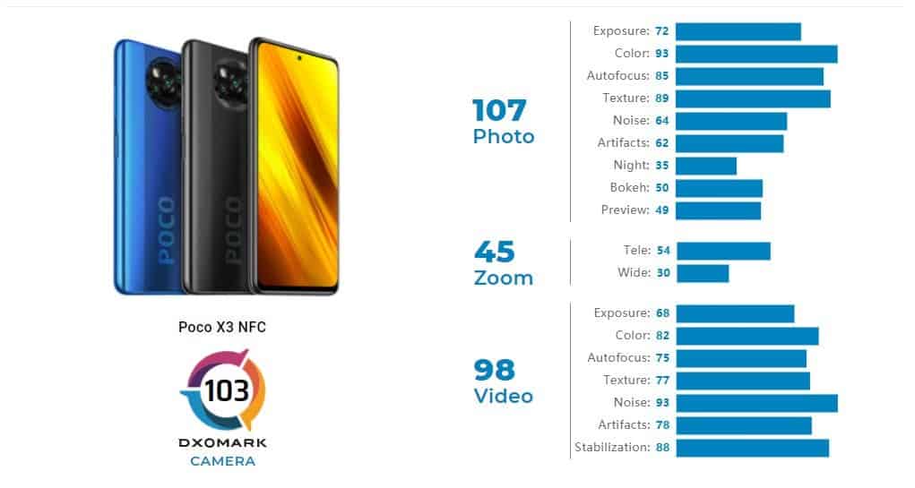 Według ekspertów DxOMark, zdjęcia aparatem POCO X3 NFC powinny zadowolić dobrą ekspozycją i szczegółowością zdjęć portretowych, a także wyświetlaniem przyjemnych odcieni skóry. Użytkownicy powinni również docenić szybkie ustawianie ostrości w jasnym świetle oraz podczas robienia zdjęć w pomieszczeniach. Eksperci zwrócili uwagę na dokładny balans bieli i skuteczną stabilizację podczas nagrywania wideo. A usterki autofokusa, szum cyfrowy, przebarwienia i ograniczony zakres dynamiki mogą być rozczarowujące.