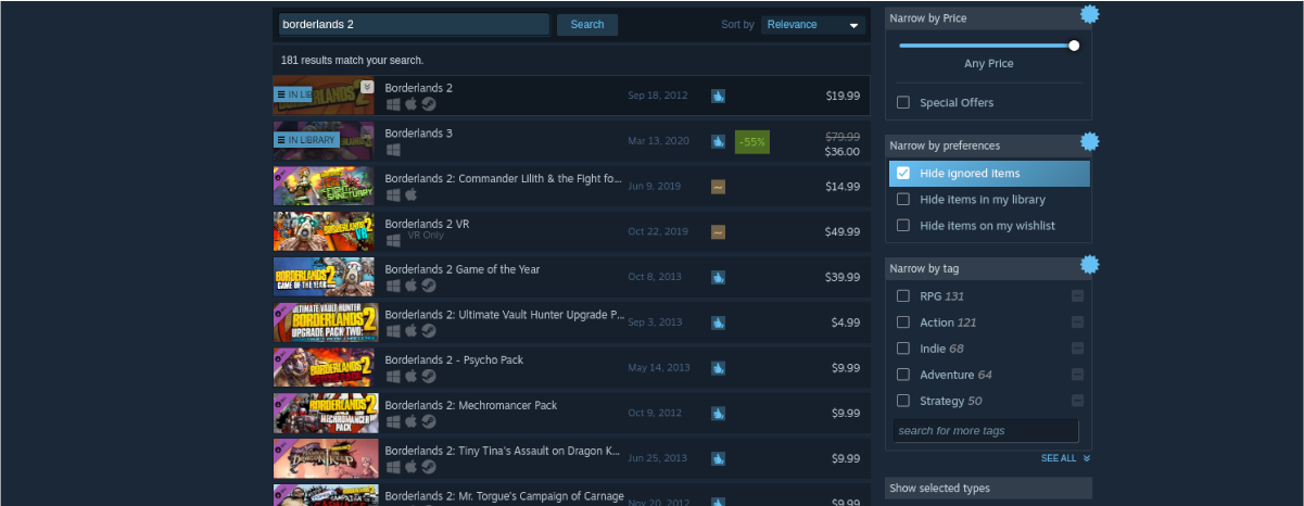Po kliknięciu pola wyszukiwania wpisz „Borderlands 2” i naciśnij klawisz Enter , aby wyświetlić wyniki wyszukiwania. Przejrzyj wyniki dla „Borderlands 2” i kliknij ją, aby uzyskać dostęp do strony Storefront gry.