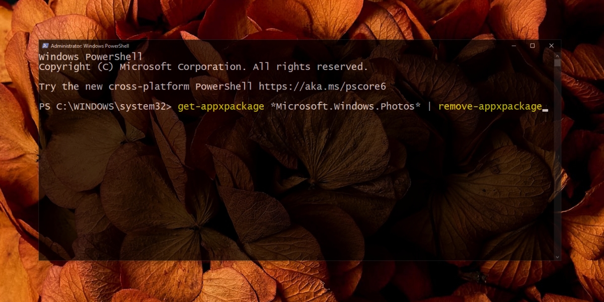 get-appxpackage *Microsoft.Windows.Photos* | usuń pakiet aplikacji