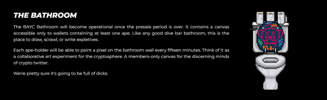 Ponadto popularna kolekcja NFT o nazwie Bored Ape Yacht Club ma ekskluzywną łazienkę społecznościową, w której użytkownicy mogą rysować graffiti. W zależności od rodzaju zakupionego NFT, możesz uzyskać inne wyraźne korzyści.