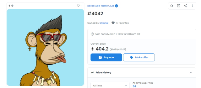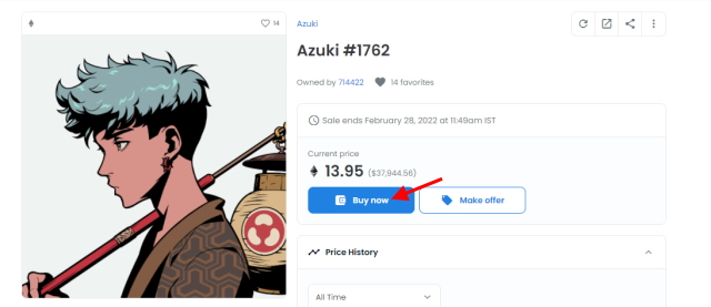 7. Jeśli chcesz po prostu kupić NFT od razu, możesz przewinąć wstecz i poszukać takiego, który nie jest licytowany. W takim przypadku zobaczysz walutę jako głównie ETH, więc będziesz potrzebować konta Ethereum. Po przekonaniu awatara i jego ceny, kliknij Kup teraz, aby go kupić.