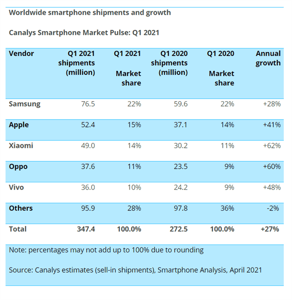 Zgodnie z wynikami pierwszego kwartału tego roku, Samsung zachowuje pozycję lidera; który kontroluje 22% rynku urządzeń mobilnych. Na drugim miejscu jest Apple z 15% udziałem, a na trzecim Xiaomi z 14% udziałem. Chińskiej firmie udało się osiągnąć pozycję lidera pod względem tempa wzrostu-62% rocznego wzrostu.