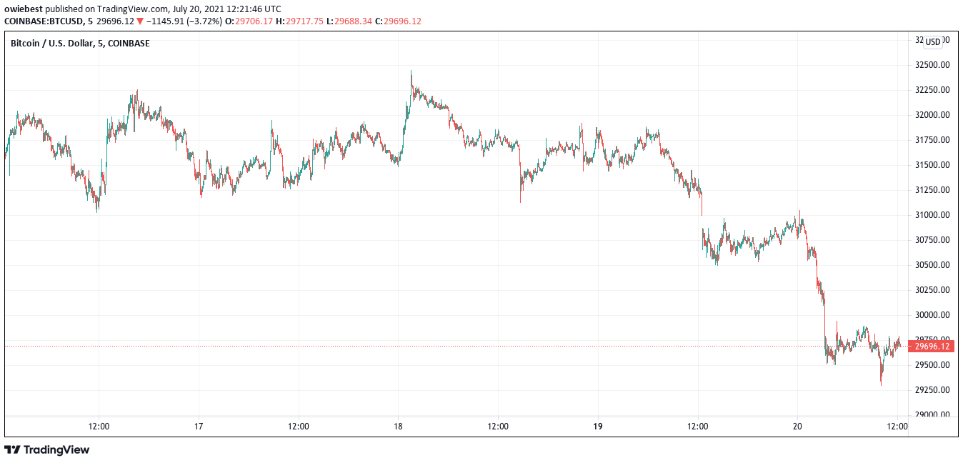 Cena Bitcoina spada poniżej 30 000 USD | Źródło: BTCUSD na TradingView.com