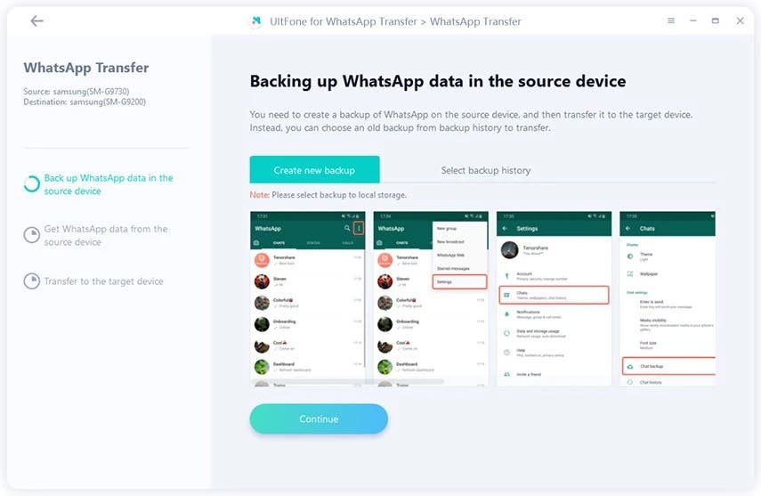 - Utwórz kopię zapasową danych WhatsApp na oryginalnym źródłowym urządzeniu z Androidem
