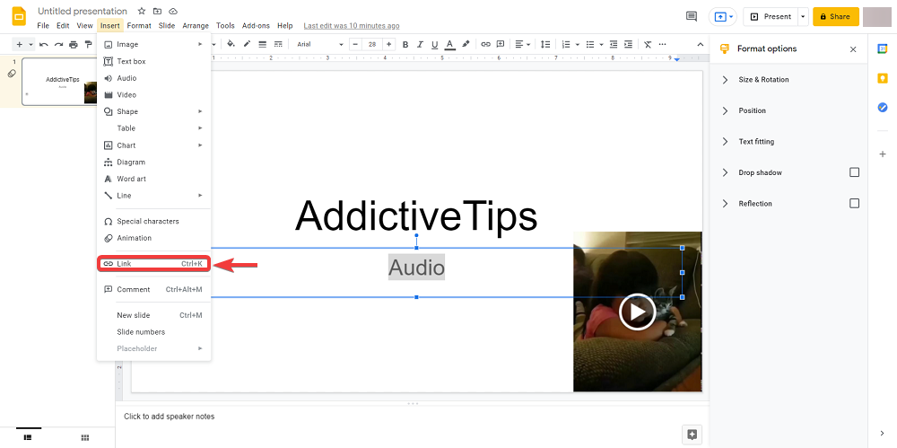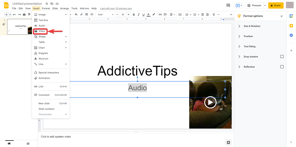Ta metoda polega na wstawieniu rzeczywistego filmu do prezentacji Prezentacji Google, a ponieważ nie ma z niego tylko dźwięku, musisz ukryć film za obrazem lub uczynić go tak małym, aby zmieścił się gdzieś za ikoną.