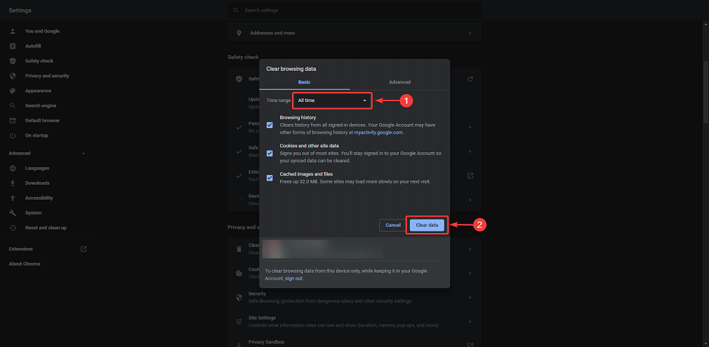 5. Zaznacz wszystkie pola i wybierz opcję Cały czas , gdy pojawi się pytanie o przedział czasu, a na koniec kliknij opcję Wyczyść dane.