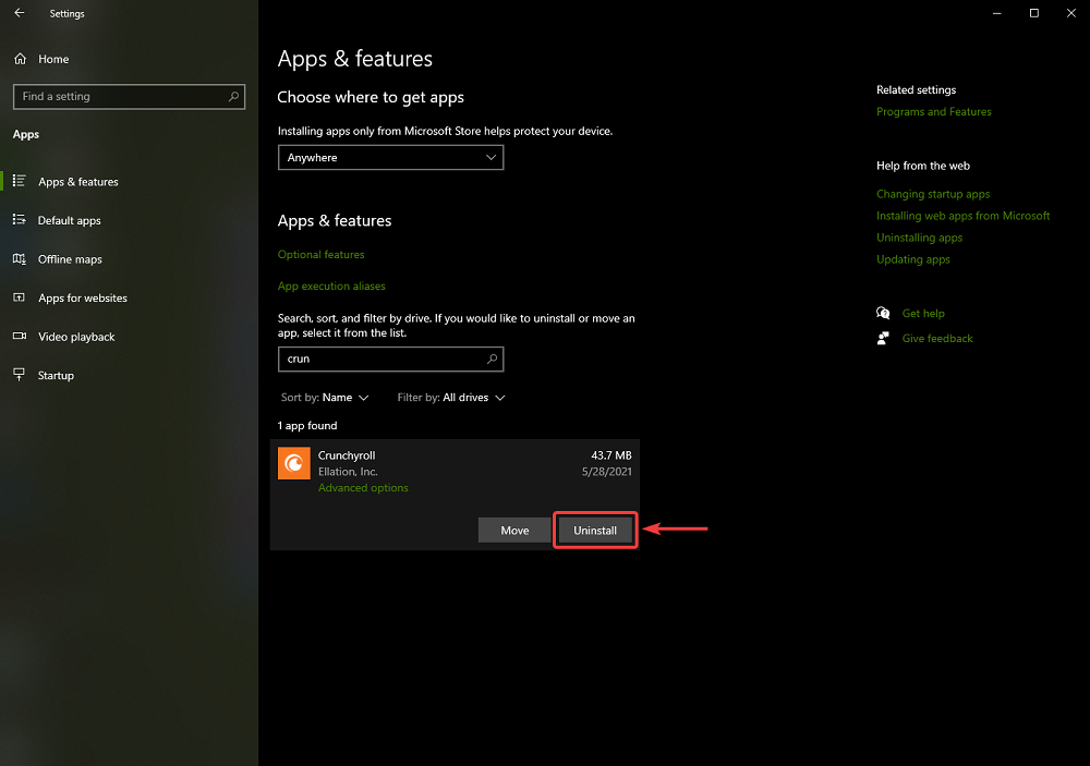 Crunchyroll jest również dostępny jako aplikacja UWP Store, którą każdy może pobrać bezpłatnie ze sklepu Microsoft Store, a czasami problemy z odtwarzaniem mogą być spowodowane przez samą aplikację.