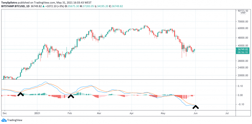 Logarytmiczny MACD pokazuje, że pęd skręca w górę | Źródło: BTCUSD na TradingView.com