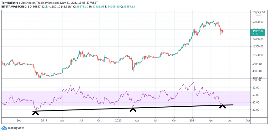 Przechodząc do wyższego przedziału czasowego, cena Bitcoina również odbiła się od rosnącej linii trendu wsparcia RSI na wykresie trzydniowym (poniżej).