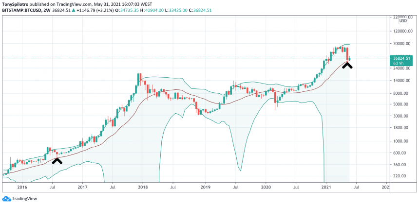 Rzadko oglądany dwutygodniowy przedział czasowy pokazuje, że Bitcoin spadł do średniego poziomu SMA na Wstęgi Bollingera. Podczas ostatniej hossy linia nigdy nie została utracona. W rzeczywistości dotknięcie go spowodowało ostateczny impuls w górę.