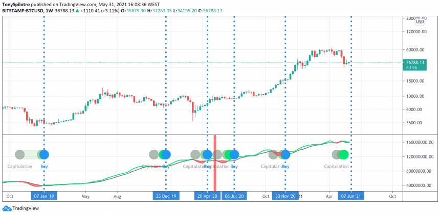 Niedawne przesunięcie w dół spowodowało również najbardziej opłacalny sygnał kupna wskazujący na „kapitulację” górników BTC. Poprzednie hossy odnotowały ponad 8 000% i 3500% po pojawieniu się ostatniego sygnału kupna na cykl.