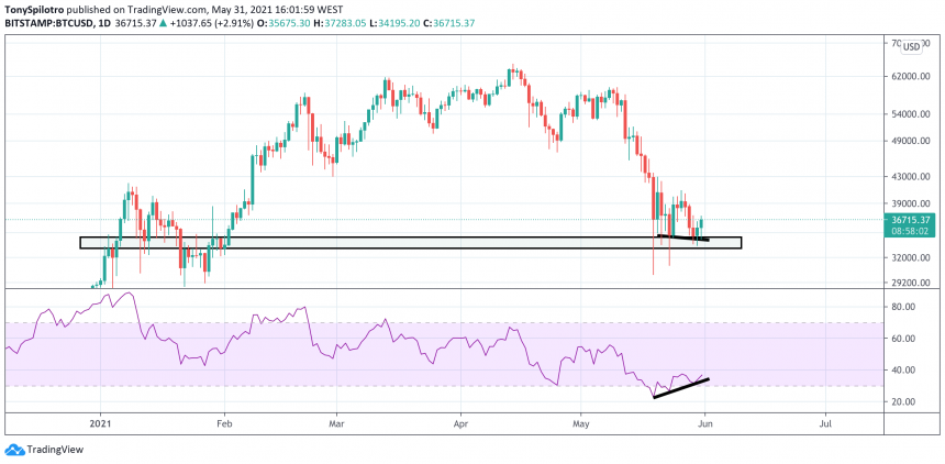 Raczej dane techniczne dotyczące prawie wszystkich przedziałów czasowych wskazują na odwrócenie trendu. Pierwsza w historii kryptowaluta tworzy zwyżkową dywergencję (powyżej) przy codziennym wsparciu. Odbicie nastąpiło, gdy Relative Strength Index osiągnął wyprzedane poziomy.