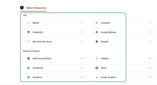 3. Aby rozpocząć, musisz połączyć się ze źródłem danych. Jak wspomniano wcześniej, Equals zapewnia szereg wbudowanych połączeń danych z MySQL, PostgreSQL, Microsoft SQL Server, Google BigQuery, Hubspot, Sales Force i nie tylko.