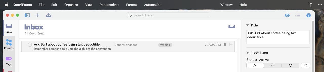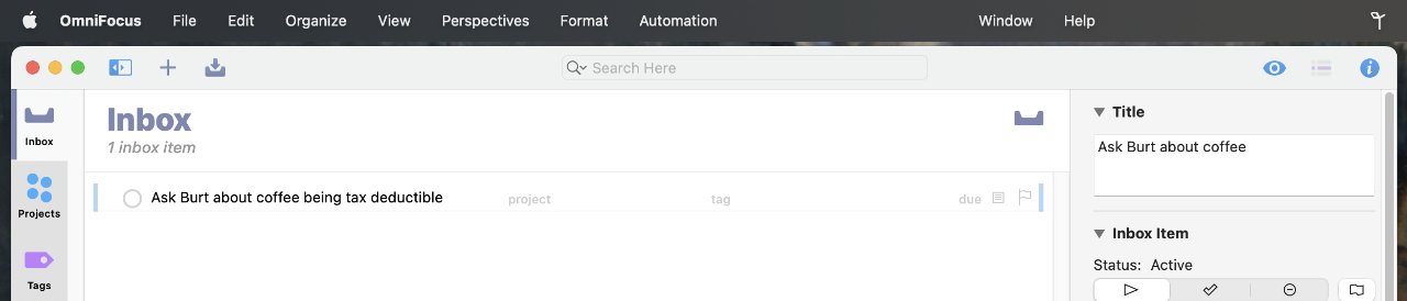OmniFocus ma skrzynkę odbiorczą, w której możesz po prostu zanotować nieparzyste zadanie, a później odhaczać je w trakcie. Ale to byłoby jak kupowanie odrzutowca Leara, żeby latać po szkole.