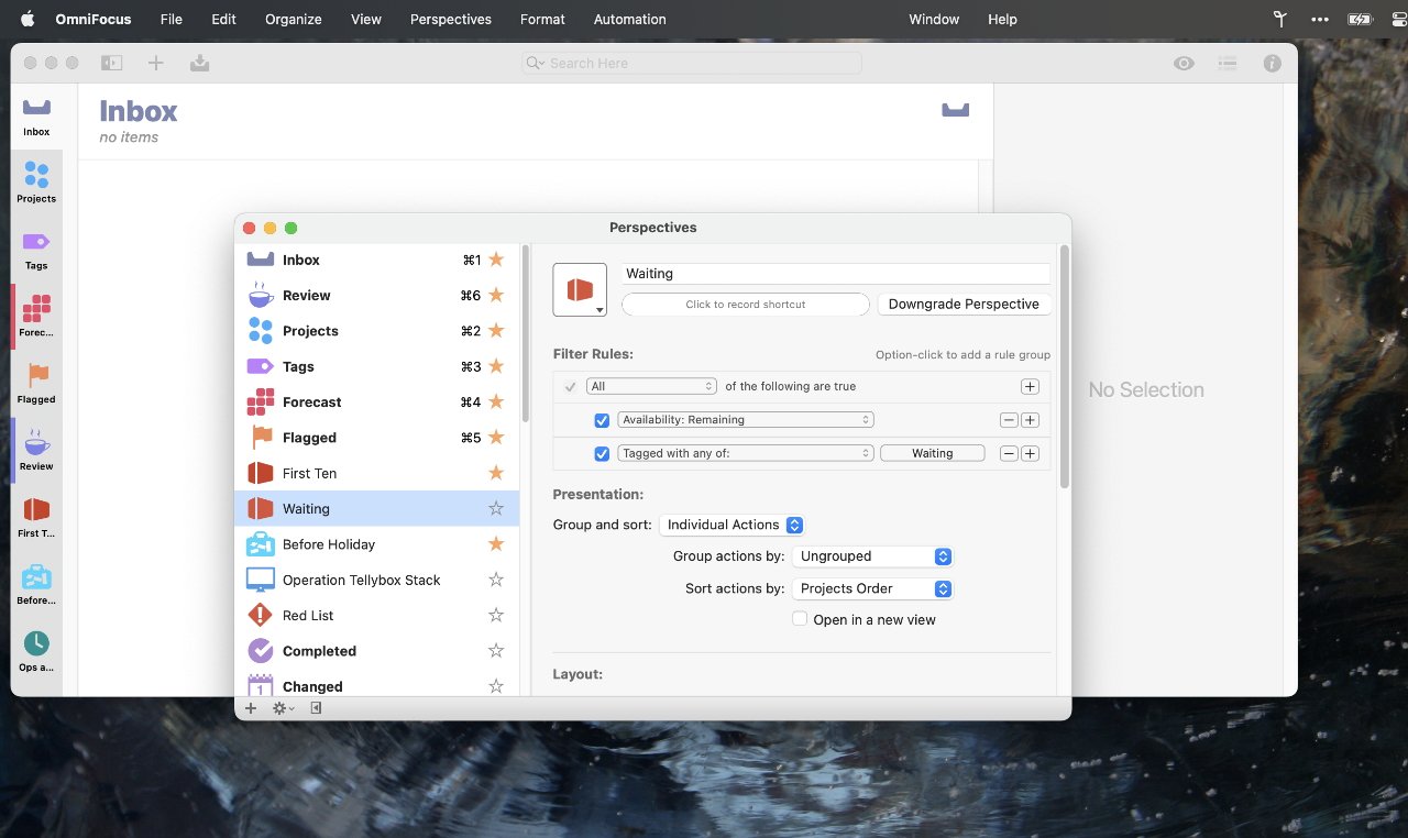 Ten tryb skupienia bardzo dobrze usuwa zakłócenia, ale ponieważ zawsze możesz po prostu nie patrzeć na nic poza bieżącym projektem, nie jest to konieczne. Nie warto płacić różnicy, aby uzyskać wersję Pro OmniFocus — ale niestandardowe perspektywy są.
