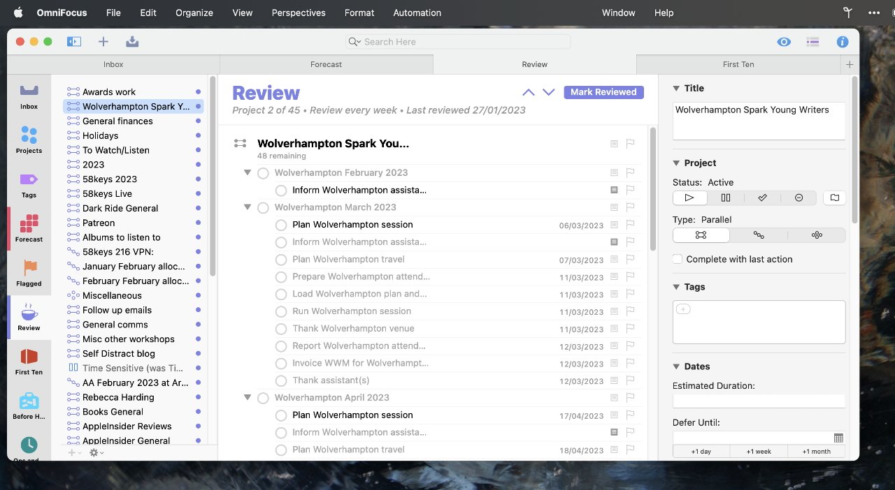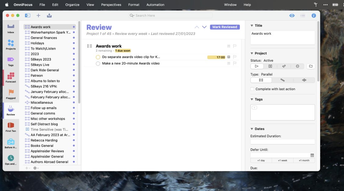 Jeśli masz setki zadań, łatwo je zgubić, nawet jeśli nie masz ogromnych numery ukryte do następnego wtorku. Pożyczając ponownie od Getting Things Done, OmniFocus ma funkcję recenzji, która ma na celu rozwiązanie tego problemu.