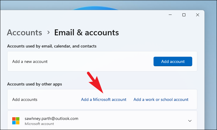 Następnie kliknij przycisk „Dodaj konto Microsoft”, aby kontynuować. Spowoduje to otwarcie nowego okna na ekranie.