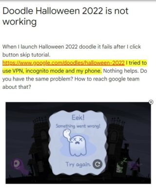 Doodles Halloween 2022 nie działa, ciągle mówi, że coś poszło nie tak. Mogę dostać się na stronę, pomiń tut. ale potem pojawia się komunikat „Eek, coś poszło nie tak, spróbuj ponownie”. Próbowałem znaleźć odpowiedzi, przeglądając Twittera, wyszukiwarkę Google i fora, ale bez odpowiedzi.