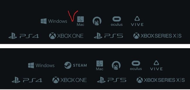 Zrzut ekranu powyżej tego akapitu pokazuje porównanie tego, jak wyglądała sekcja „obsługiwane platformy” i jak wygląda teraz. Logo „Steam” znajdowało się pomiędzy logo „Windows” i „Mac”.
