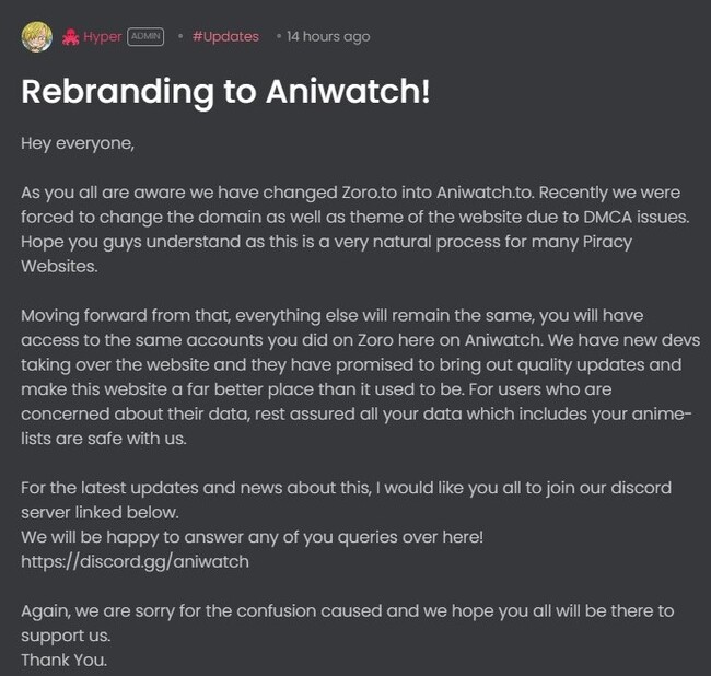 12:08 (IST): Zespół Zoro.to wydał oficjalne oświadczenie potwierdzające zmianę nazwy marki na Aniwatch i jej przyczyny.