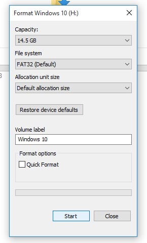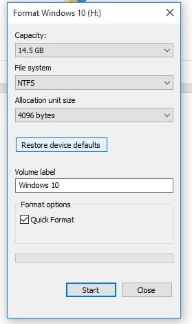 3. Teraz kliknij Start, aby rozpocząć proces formatowania. Możesz odznaczyć opcję Szybkie formatowanie, aby dokładniej przeskanować.