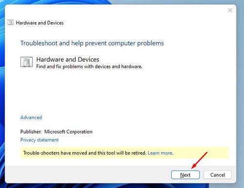 3. Spowoduje to otwarcie Narzędzia do rozwiązywania problemów ze sprzętem i urządzeniami. Kliknij przycisk Dalej.