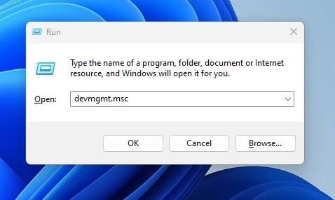 1. Otwórz okno dialogowe URUCHOM i wpisz devmgmt.msc. Otworzy się Menedżer urządzeń.