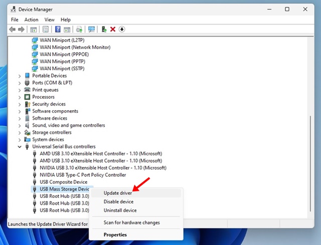 3. Jeśli nie ma nieznanych urządzeń, kliknij prawym przyciskiem myszy urządzenie pamięci masowej USB i wybierz Aktualizuj sterownik.