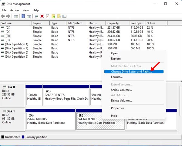 2. W narzędziu do zarządzania dyskami kliknij prawym przyciskiem myszy dysk, którego literę chcesz zmienić. Tutaj musisz wybrać podłączony dysk USB. W menu prawym przyciskiem myszy wybierz Zmień literę dysku i ścieżki.