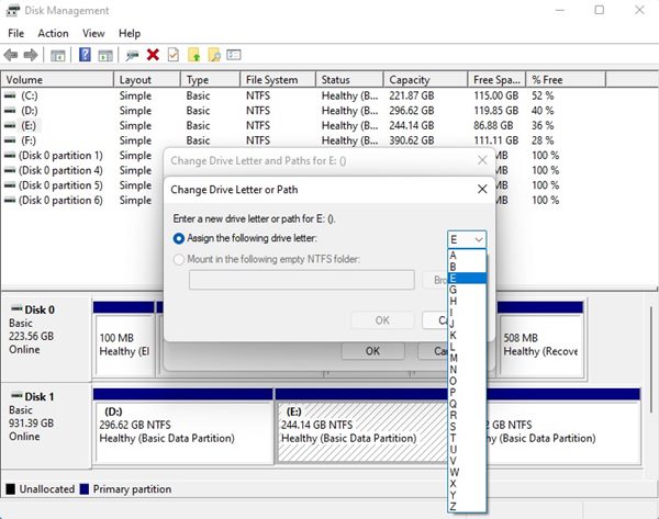 4. W następnym monicie wybierz Przypisz następującą literę dysku i wybierz literę dysku z listy rozwijanej.
