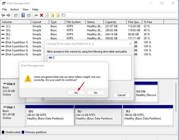 5. Zobaczysz monit o potwierdzenie; kliknij przycisk Tak, aby zmienić literę dysku.