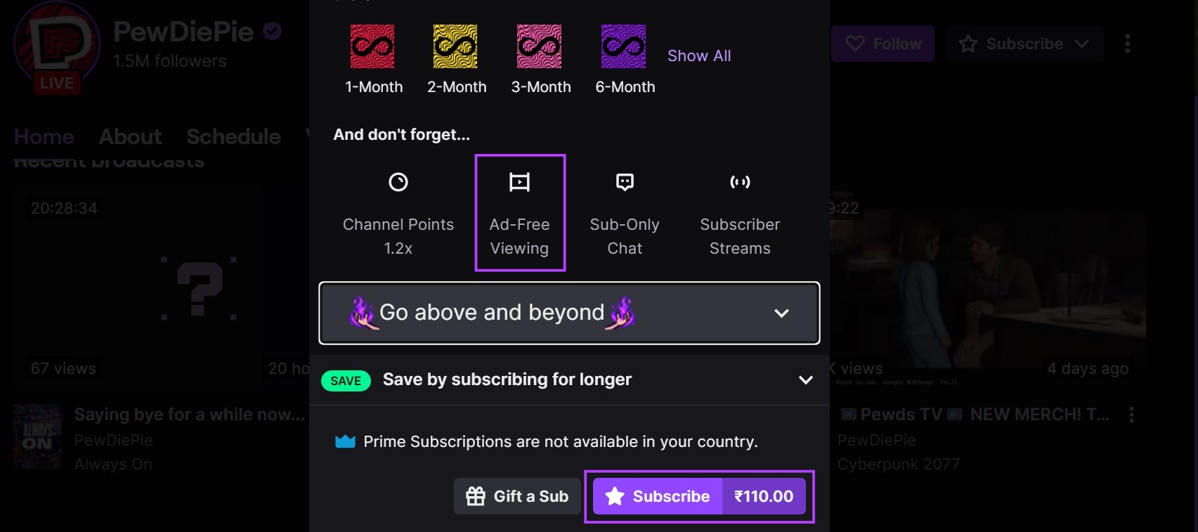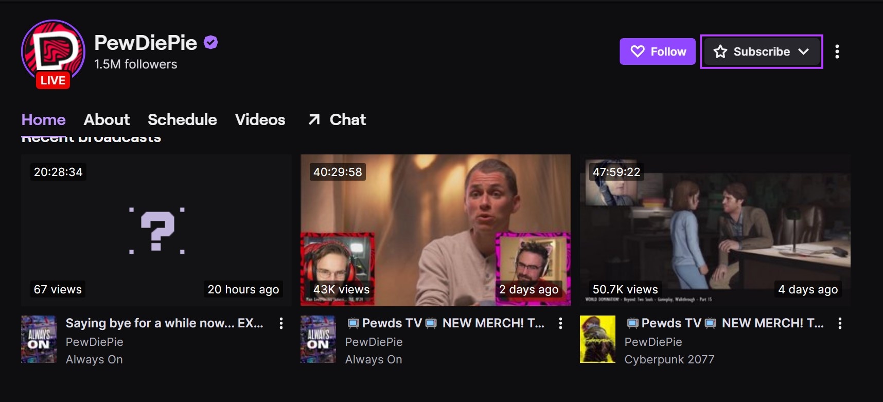 Twitch oferuje również ekskluzywne subskrypcje, które pozwalają użytkownikom subskrybować wybrany przez nich kanał. Gdy to nastąpi, użytkownicy będą mogli nie tylko wspierać preferowany kanał/twórcę, ale także uzyskać pewne ekskluzywne korzyści, takie jak specjalne transmisje dla subskrybentów i oglądanie na tym kanale bez reklam.