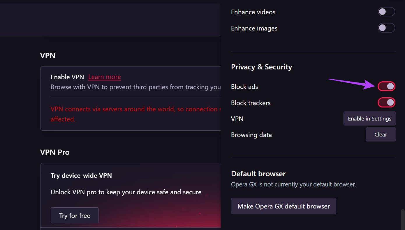 Niektóre przeglądarki, takie jak Opera GX, Brave i Vivaldi > mają natywne funkcje blokowania reklam, których można łatwo użyć do blokowania reklam na Twitchu. Ponadto można je uznać za bardziej godne zaufania w przypadku danych Twitcha niż jakiekolwiek inne rozszerzenia innych firm lub klienci blokujący reklamy Twitcha.