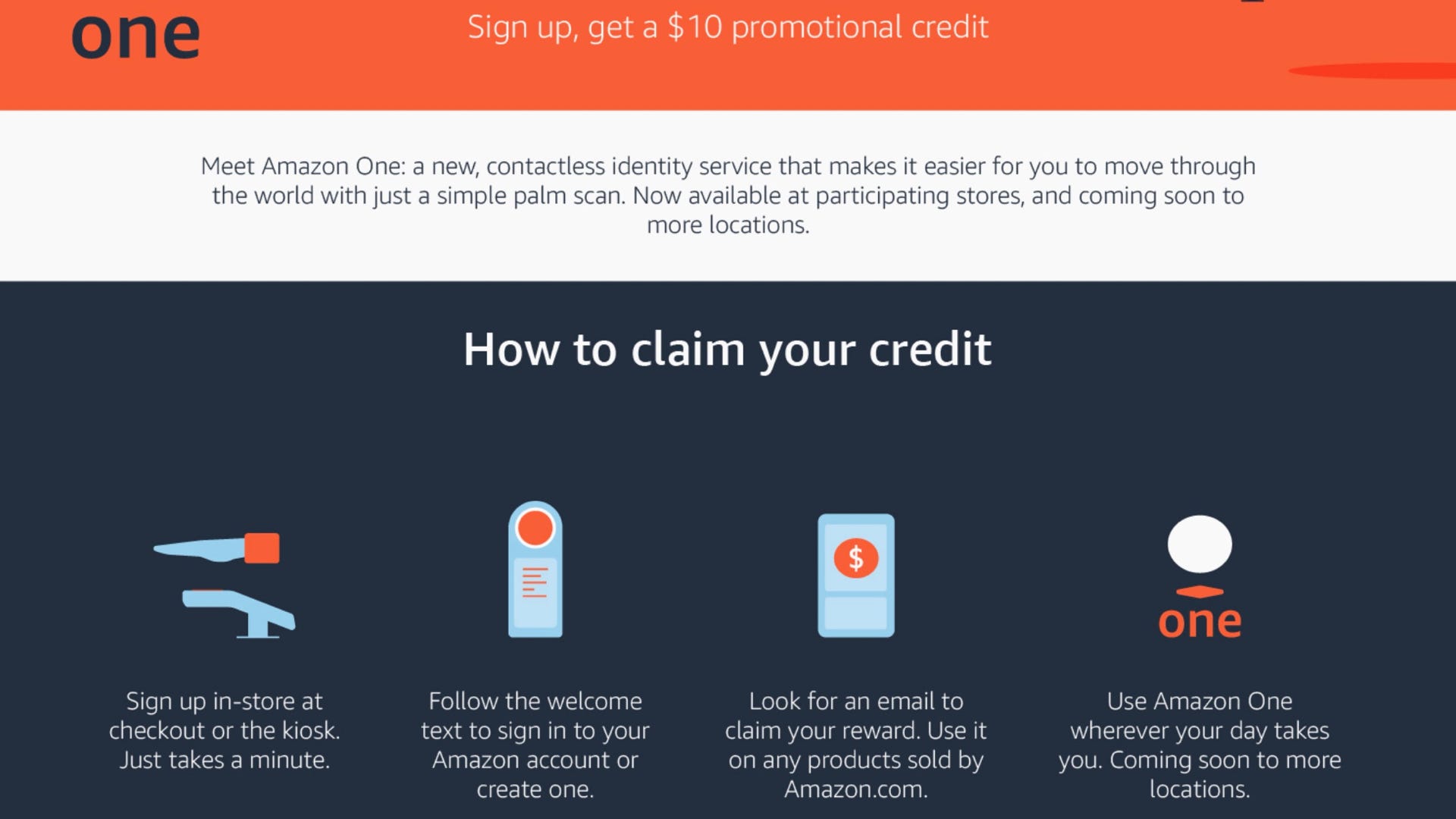 Według Amazon , twój odcisk dłoni jest wart około 10 dolarów kredytu w swoim sklepie. Po zarejestrowaniu możesz używać dłoni, aby bezpiecznie płacić za towary na sklepy detaliczne bez kasy. A jeśli zarejestrujesz się teraz, Amazon przyzna ci 10 USD kredytu promocyjnego. Czy to brzmi jak dobry interes?