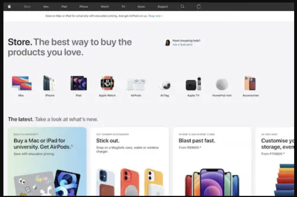 Sekcje nowej karty prowadzą do dedykowanej sekcji zakupów, w której klienci mogą wybierać z linii produktów Apple, w tym popularnych gadżetów, takich jak iPhone, Mac, iPad, Apple Watch i Apple TV. Ta nowa regulacja ułatwia konsumentom wybór z eklektycznej gamy produktów, ponieważ nie wymaga już odwiedzania każdej strony produktu w celu dokonania zakupu. Wystarczy jedno kliknięcie na produkt, aby wyświetlić karuzelę wyświetlającą wszystkie aktualnie dostępne modele. W przeciwieństwie do poprzedniej wersji jest to subtelna, ale istotna zmiana ze strony programistów jednej z wiodących firm technologicznych na świecie.