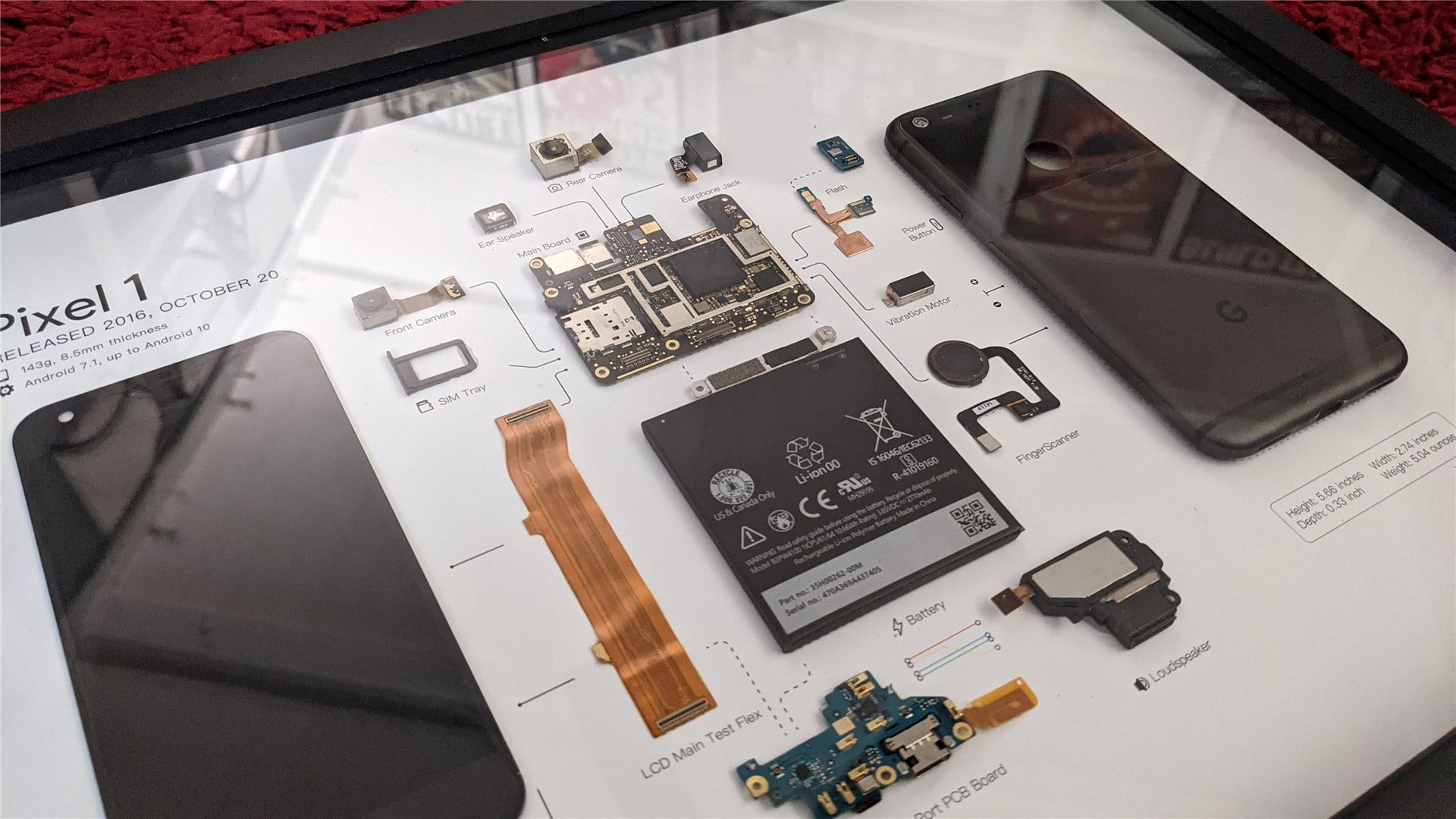 Ale nie chodzi tylko o to, co to jest, ale także o to, jak dobrze jest rozplanowany. Cały układ tutaj jest urzekający, jak coś, co można zobaczyć w muzeum. Każdy z głównych elementów Pixela 1 jest ułożony w sensowny sposób, z ekranem po jednej stronie i tyłem po drugiej, a wszystkie wnętrzności pośrodku. Bateria i płyta główna są wyśrodkowane, a wszystkie inne komponenty eksplodują stamtąd.