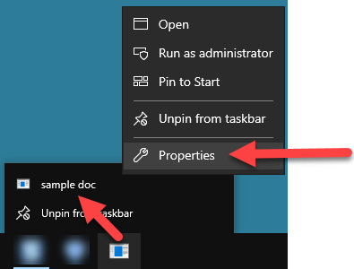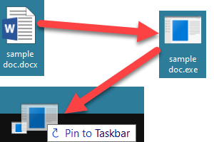 Поскольку элементы панели задач должны быть исполняемыми файлами или ярлыки для исполняемых файлов, нам нужно изменить имя документа, чтобы иметь расширение EXE. Затем вы можете обманом заставить Windows закрепить его. Просто щелкните правой кнопкой мыши переименованный файл и Закрепить на панели задач или перетащите его левой кнопкой мыши на панель задач.