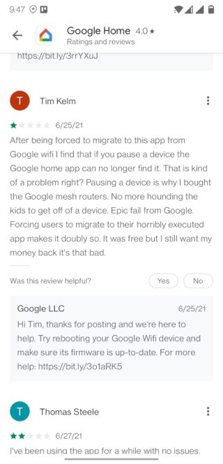С тех пор эта проблема была широко доведена до сведения Google затронутыми пользователями на различных платформах, включая Google Play Store, и взамен Google просил затронутых пользователей обновить прошивку своих маршрутизаторов и свои приложения Google Home до последних версий..