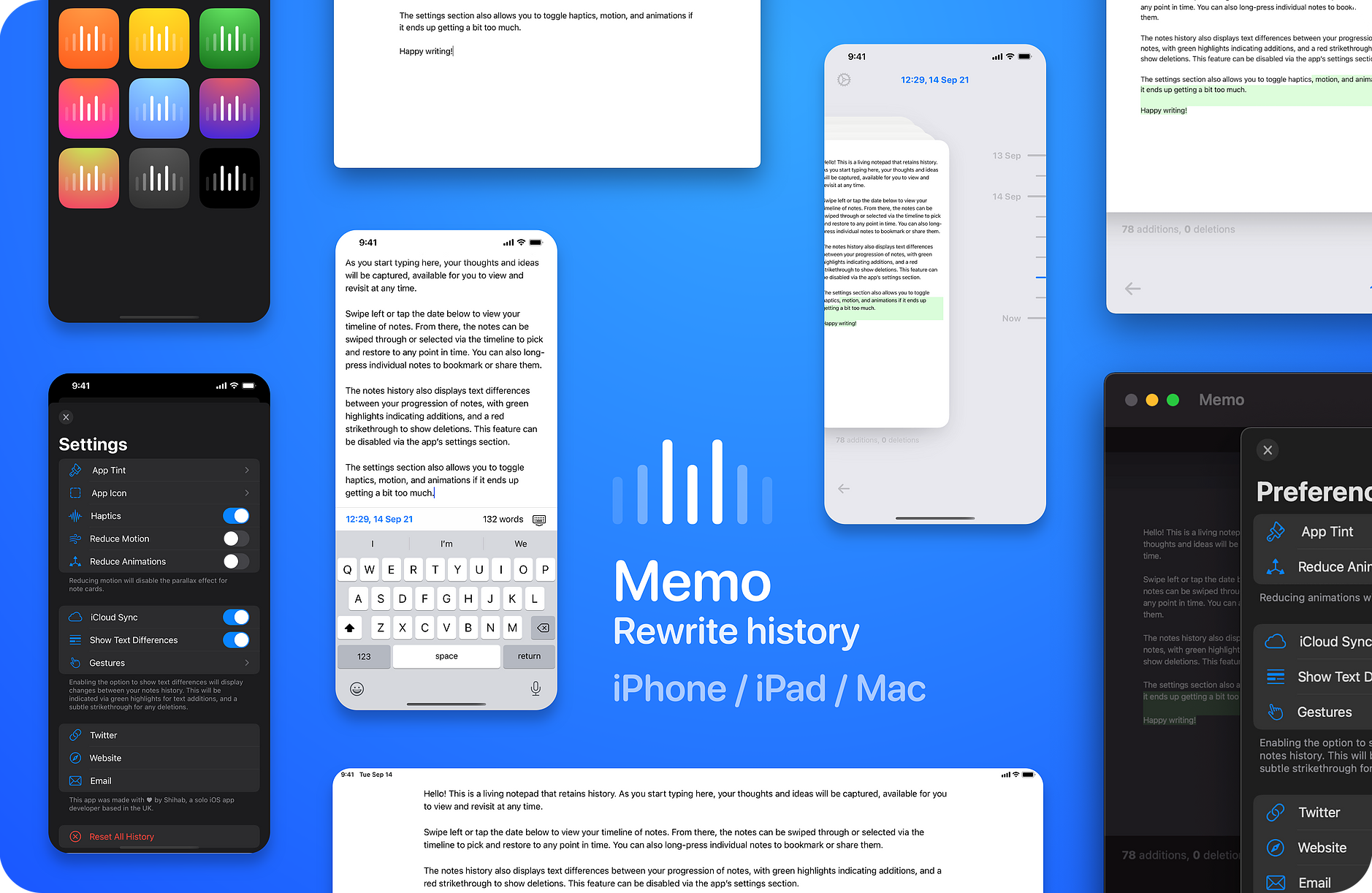 Любые дополнения и удаления хранятся в хронологии истории. Вы можете легко перемещаться вперед и назад во времени по заметке. Приложение покажет вам разницу в тексте между отметками времени.