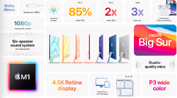 Apple says that instead of a large thermal board required with previous Intel chips, the M1 SoC needs just two fans that create all of 10dB noise – which is quite impressively low. The display is just 11.5mm thick, and measures 24 inches, with 4480 x 2520 pixels resolution. It’s a 4.5K Retina display, which also has True Tone.