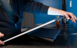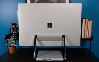 แผงหน้าจอสัมผัสติดตั้งบนสิ่งที่ Microsoft เรียกว่า”บานพับไร้แรงโน้มถ่วงเป็นศูนย์”ขาตั้งบานพับคู่ช่วยสปริงช่วยให้คุณวางหน้าจอในแนวตั้งสำหรับการใช้งานเดสก์ท็อปแบบเดิมหรือลงต่ำเพื่อการใช้งานสไตลัสและหน้าจอสัมผัสที่สะดวกสบายยิ่งขึ้น