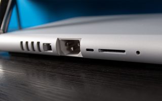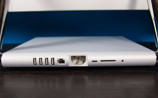 The Surface Studio’s square-shaped base has a rounded back end, which matches the curve of the bottom hinge on the stand. Set into that curved rear face, you’ll find four USB 3.0 ports, one USB Type-C port, a full-size SD card reader, a Gigabit Ethernet port and a 3.5mm jack for sound.