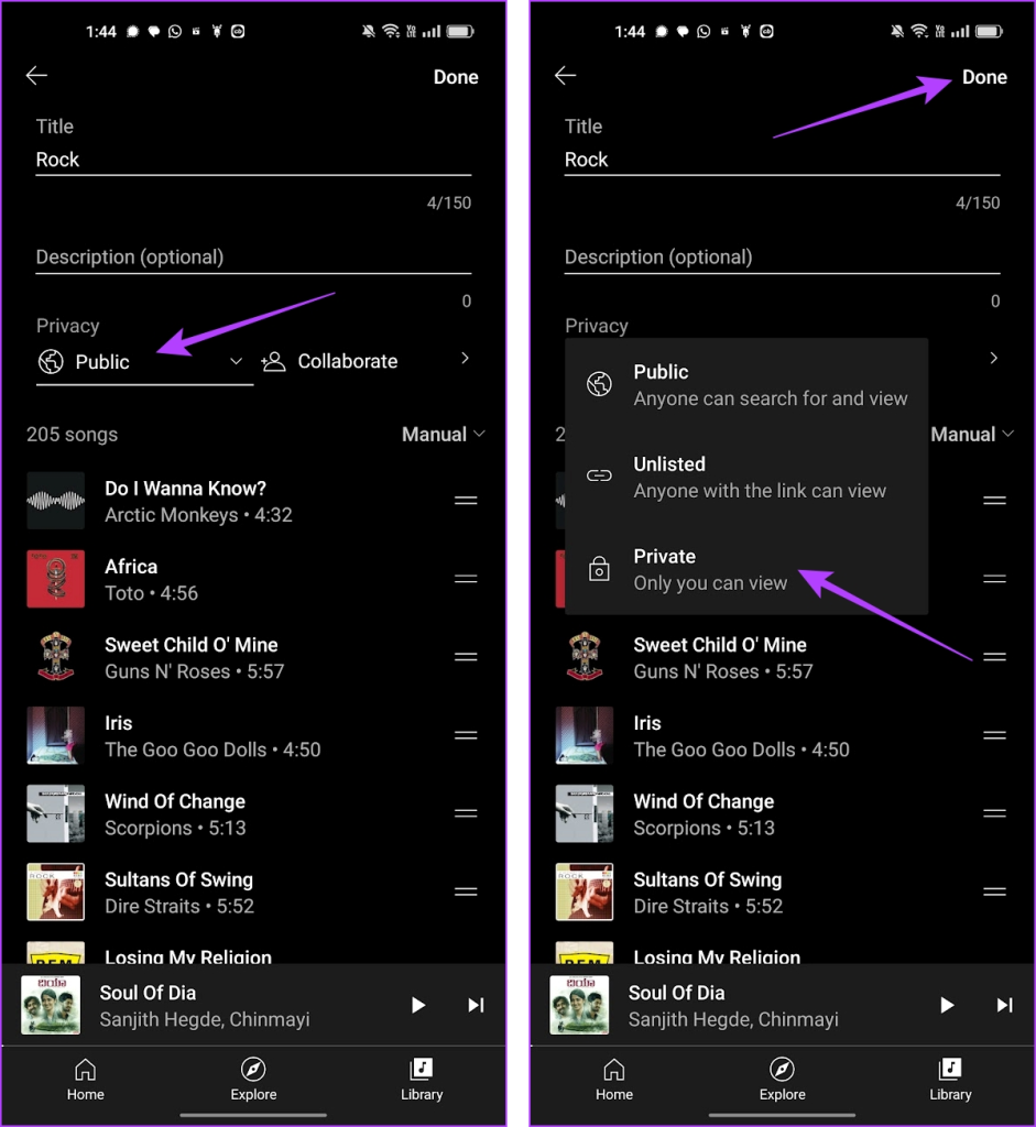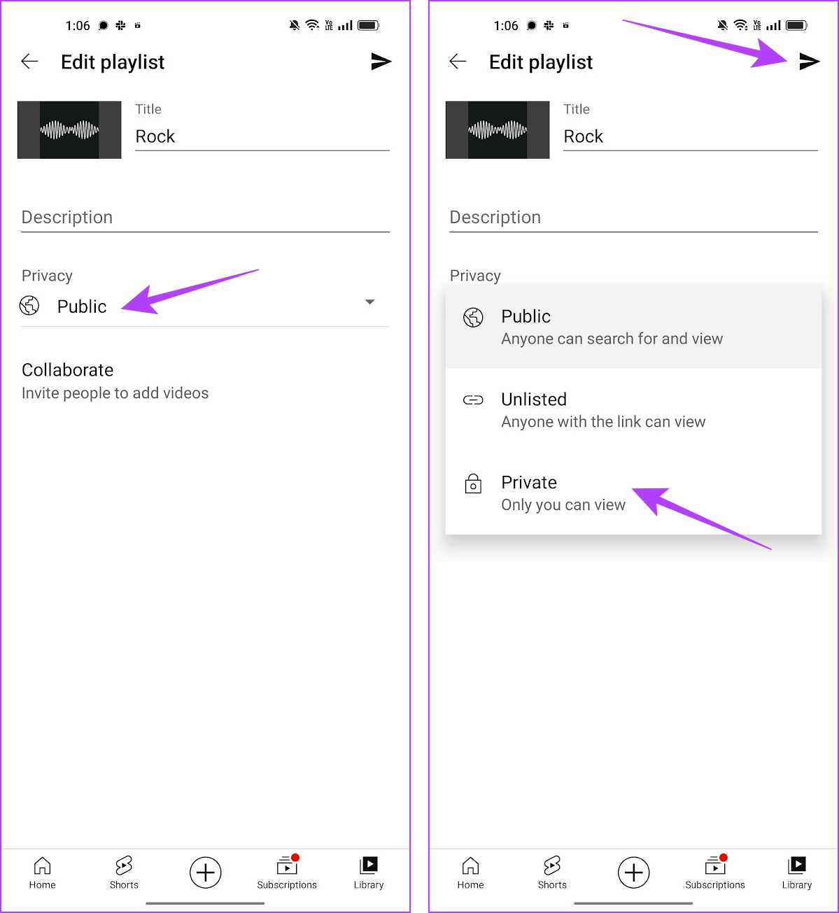 Hakbang 5: Kapag nabuksan na ang playlist, i-tap ang Pampublikong button para baguhin ang mga setting ng privacy.