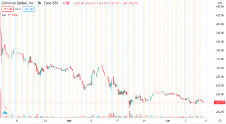 Kể từ khi công khai thông qua niêm yết trực tiếp vào tháng 4, đây là một bước trượt ổn định đối với Coinbase. | Nguồn: $ COIN-NASDAQ trên TradingView.com