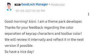 Đáp lại đề xuất này, một nhà phát triển Samsung Theme Park cho biết họ sẽ xem xét nội bộ và triển khai nó trong phiên bản tiếp theo nếu có thể.
