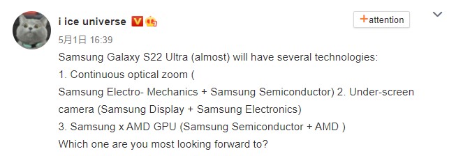 Ngoài ra, Ice Universe đề cập rằng Galaxy S22 Ultra sẽ có GPU AMD. Trước đây, người đưa tin đã đề cập rằng Samsung sẽ ra mắt bộ xử lý đồ họa này cùng với Exynos SoC mới vào tháng 6 năm nay, nhưng nhiều khả năng nó sẽ được sản xuất hàng loạt vào cuối năm 2021 cho loạt điện thoại thông minh hàng đầu mới. Ngoài ra, chúng ta cũng có thể mong đợi một camera selfie trong màn hình, vì Samsung có thể đã giải quyết các vấn đề về chất lượng và sản xuất hàng loạt với thành phần này.