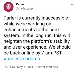 Trong một tweet tiếp theo, Parler tuyên bố rằng họ sẽ hoạt động sau 2 giờ, tuy nhiên, đã vài giờ và trang web vẫn không thể truy cập được.